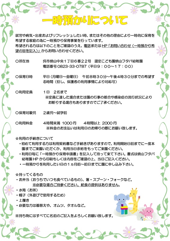 利用日に記入して持参。または内容を確認の上、当日園でご記入ください。