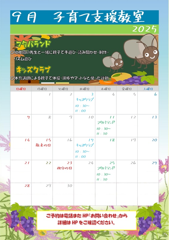 ・駐車場は数に限りがありますので、子育て支援教室参加者は公共交通機関などを利用しての来園をお願いします。(在園児の急なお迎え・緊急車両等優先のため)